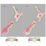 The refugia habitat metric indicates that under current conditions there are significant areas of high-suitability refugia in the current range of kōura, particularly in the western and southern North Island and across the north and west of the South Island (Fig. 7a). Additionally, there is significant refugia habitat outside the species current range, across the eastern South Island. Under future conditions, potential refugia habitat contracts, particularly within the current range in the northern North Island, although significant refugia still remain in the western North Island and South Island (Fig. 7b). There is also significant refugia habitat present outside the current range in the eastern South Island.