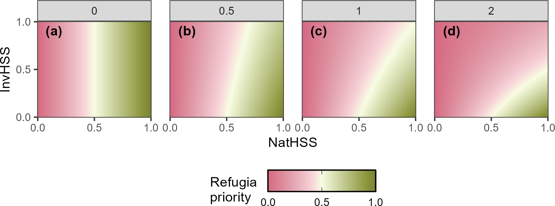 Future work could integrate dynamic modelling frameworks (e.g. process-based or agent-based models) or couple the metric with trait-based or mechanistic approaches that better capture species-specific vulnerabilities and adaptive capacities (Kearney and Porter, 2009; Pilowsky et al., 2022). Incorporating temporal dynamics, such as simulating invasive species' spread rates or native species' dispersal abilities, would allow more realistic projections under changing environmental conditions. Validation of the RHM represents a next step for advancing its application and credibility. Empirical testing could involve comparing adjusted suitability predictions to known patterns of native persistence or decline in the presence of invasive species across environmental gradients. Long-term monitoring data, experimental removals, and invasion chronosequences offer valuable opportunities to test whether areas identified as dual refugia correspond with higher native survival or reproductive success. These directions represent promising avenues for future research and development.