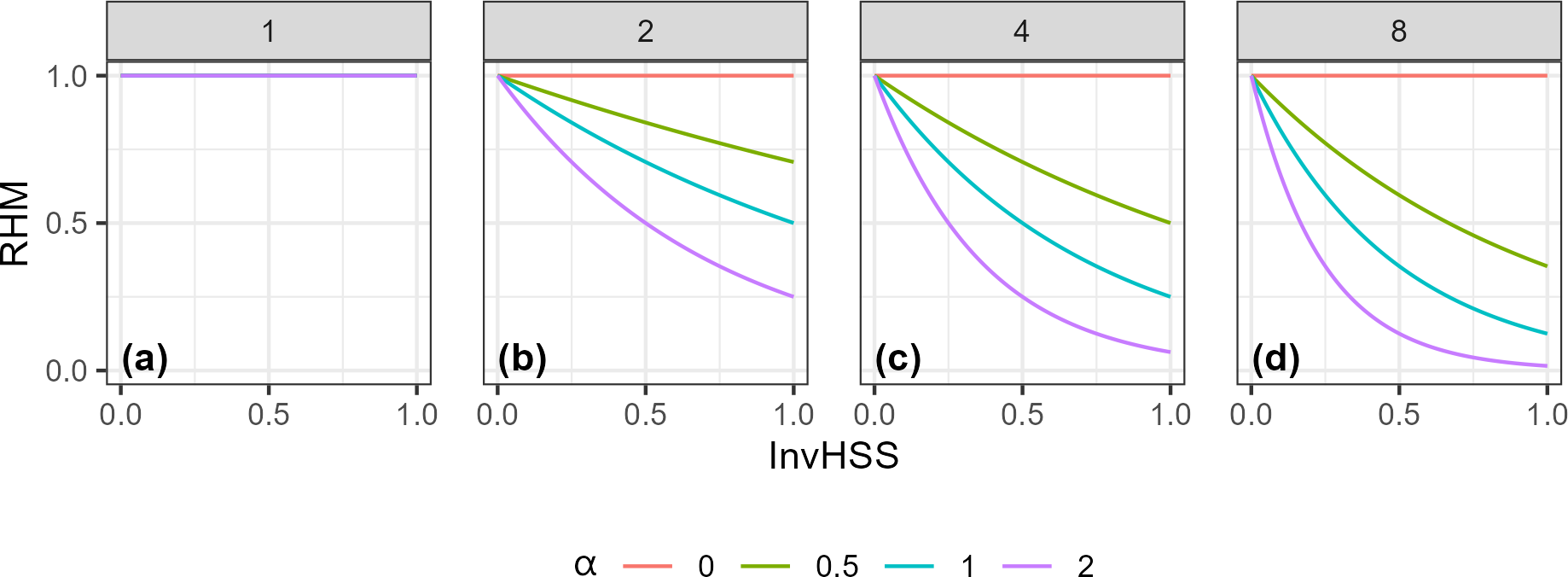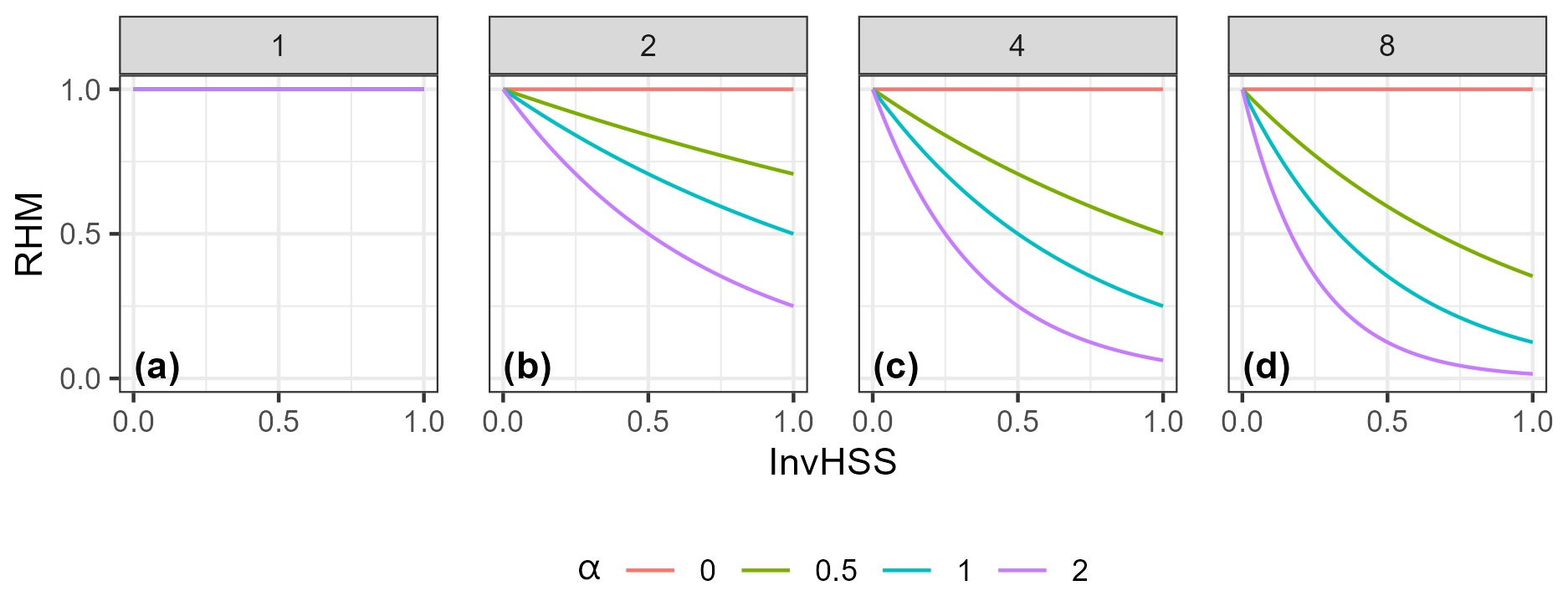 Figure 2Example of how the RHM responds to the invasive species habitat suitability score (InvHSS) for a range of invasive species habitat suitability score weighting parameter (α) values (a: 0; b: 0.5; c: 1; d: 2) when a single invasive species is present. β fixed at 2.0.