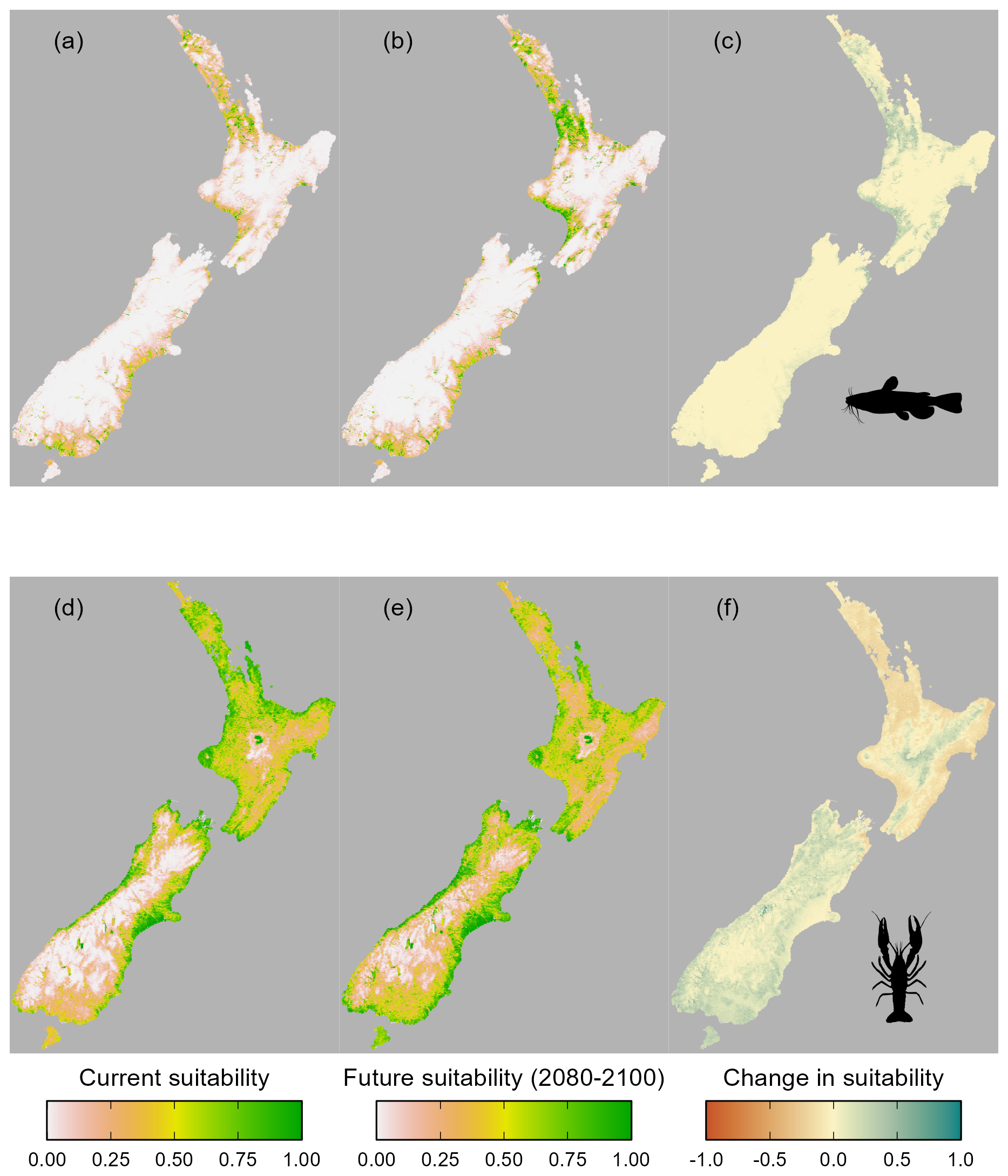 Figure 4Predicted habitat suitability of Aotearoa for (a–c) brown bullhead catfish (Ameiurus nebulosus) and (d–f) kōura (Paranephrops planifrons) under current climatic conditions (a, d) and in the period 2080–2100 (b, e), with the change in suitability between current and future conditions (c, f).