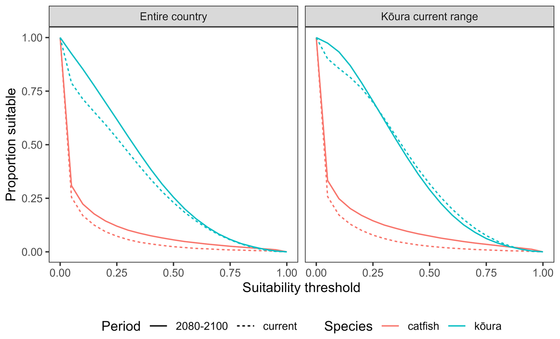 To understand how the amount of habitat available to kōura and bullhead catfish is likely to change between now and 2080–2100 and to avoid having to pick a single binarizing threshold, we calculated total available habitat for the two time periods across the full range of binarizing thresholds (0–1). Finally, we calculated the RHM for current and future time periods. All analysis was carried out in R v.4.3.2 (R Core Team, 2020). We used the tidyverse v2.0.0 (Wickham et al., 2019), terra v1.8.54 (Hijmans, 2024), and sf v1.0.21 (Pebesma, 2018) packages for data manipulation; the flexsdm v1.3.6 (Velazco et al., 2022) package for model fitting; and the tidyterra v0.7.2 (Hernangómez, 2023) and patchwork v1.3.1 (Pedersen, 2021) packages for visualization.