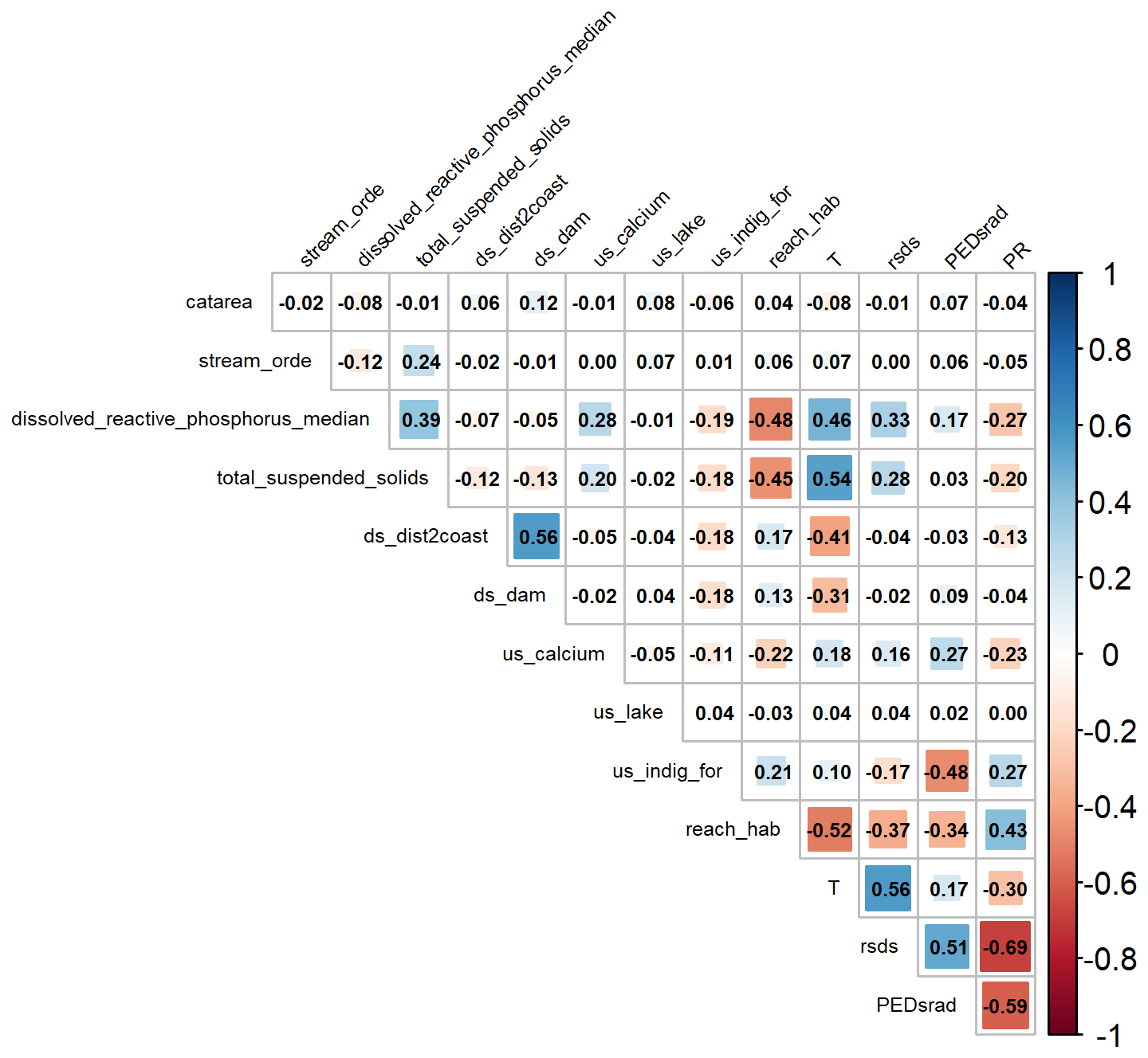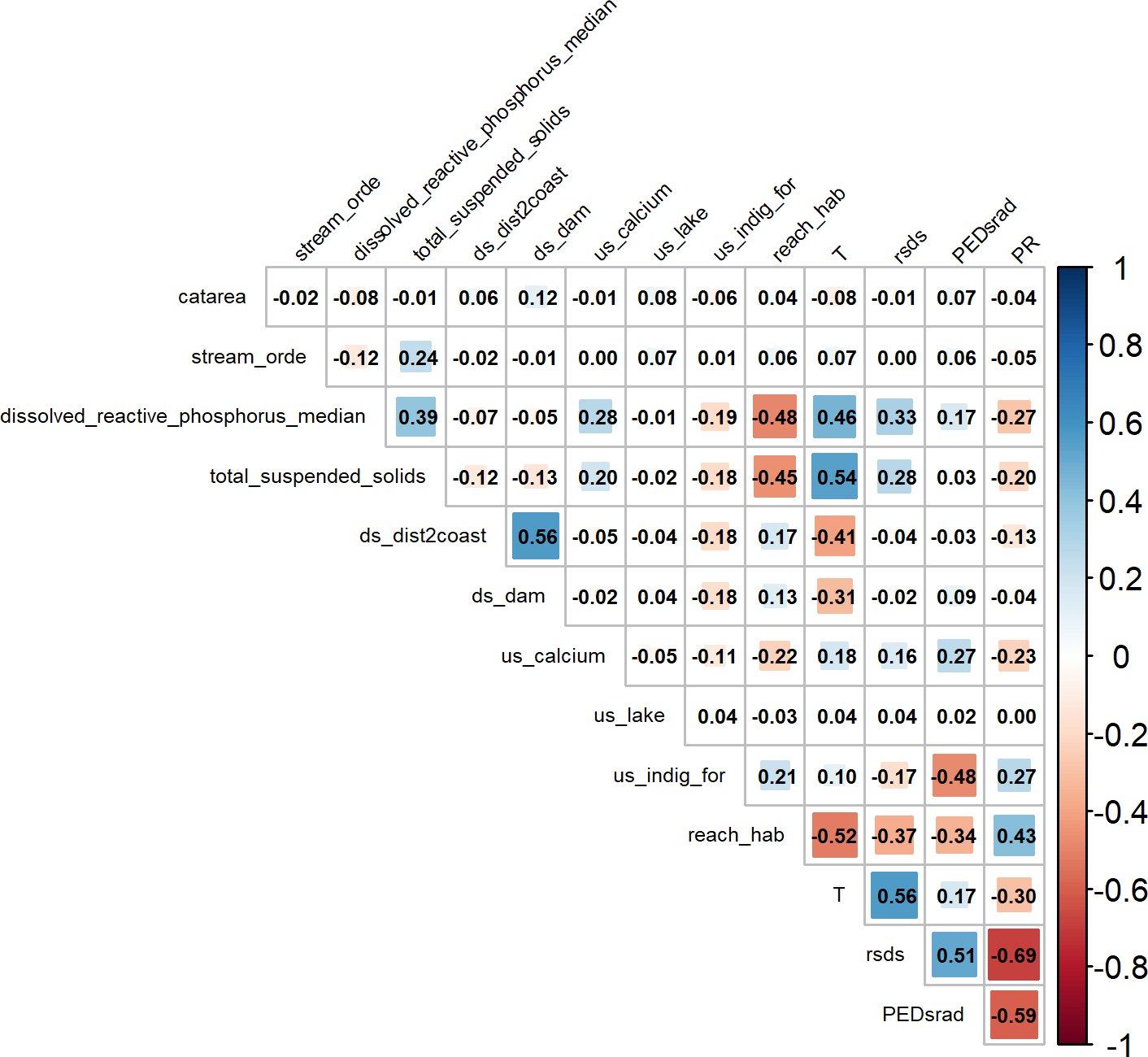Figure A2Pairwise correlations among environmental predictors used in MaxEnt models for brown bullhead catfish (Ameiurus nebulosus) and kōura (Paranephrops planifrons) habitat suitability. See Table A1 for a description of variables.
