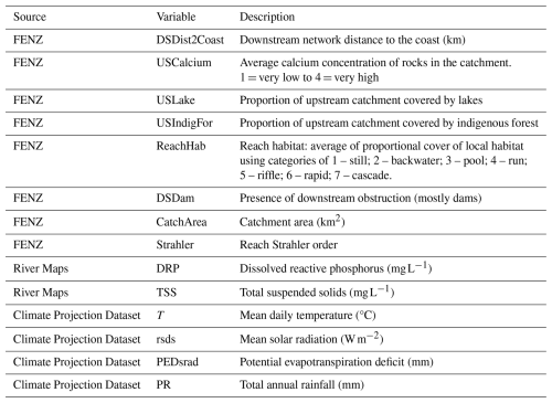 We focused on environmental and habitat variables that are ecologically important to freshwater species (Table A1). We included river-specific variables from the Freshwater Environments of New Zealand (FENZ) database. FENZ consists of a network representing all river reaches in Aotearoa, and it contains over 500 000 individual reaches (Leathwick et al., 2010). Each reach is described in terms of a series of modelled physiochemical variables such as upstream forest cover and reach slope. From the FENZ database we included the following variables: catchment area, Strahler order, median, downstream distance to the coast, upstream calcium concentration, proportion upstream catchment covered by lakes, upstream indigenous forest cover, and reach habitat type (1 = still; 2 = backwater; 3 = pool; 4 = run; 5 = riffle; 6 = rapid; 7 = cascade). Additionally, we included dissolved reactive phosphorus (DRP; Whitehead et al., 2022) and total suspended solids (TSS; Unwin and Larned, 2013) from the River Maps database (Whitehead and Booker, 2019). There are no future predictions available for the FENZ variables; therefore we assumed they would remain relatively static through time. We included ecologically important climate variables (mean daily temperature, total annual rainfall, mean solar radiation, and potential evapotranspiration deficit) from the New Zealand Climate Projection Dataset for the period 1986–2005 (Gibson et al., 2024). Air temperature variables were used as surrogates for instream temperature, as instream temperature data were not available and air temperature is correlated with instream temperature (McGarvey et al., 2018). The data have been downsampled at 5 km resolution specifically for Aotearoa from global models. Since the FENZ data were in vector format and the climate data were gridded raster data, we extracted climate data along each FENZ reach; if a reach intersected more than one grid pixel, we took the mean value across intersecting pixels. All absolute pairwise correlations among environmental variables were less than 0.7. Predictors were not transformed prior to analysis.