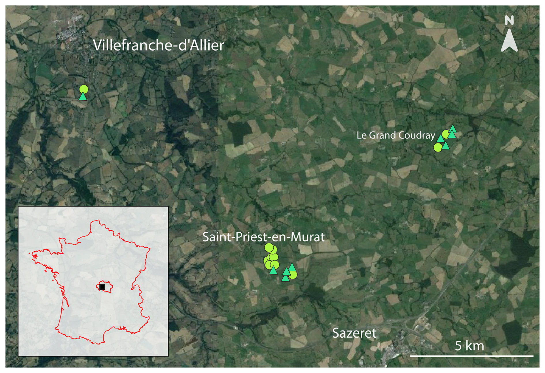 Figure 1Geographic localization of studied hedgerows in the Allier department, France. The circular points represent arboreal hedgerows (n= 11) and the triangular points represent shrubby hedgerows (n= 9) (see Sect. 2.2 Hedgerow characteristics for further details). Each white locality name has a font size corresponding to its population size. © background: Google Earth Pro.