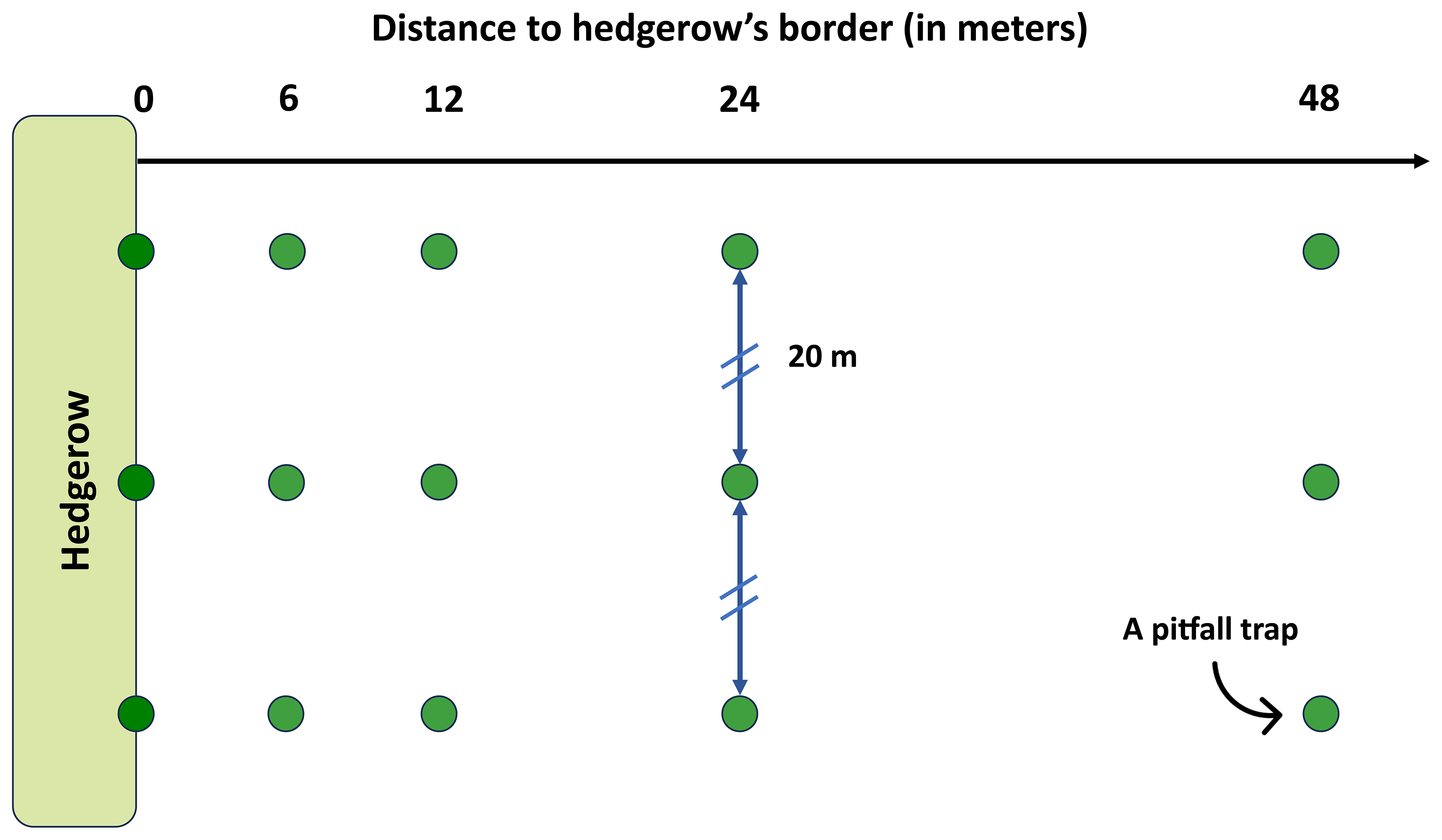 Figure 2Sampling scheme for a hedgerow. Each green point represents a pitfall trap (i.e., a Barber trap). These traps were placed at five distances from the hedgerow border to the center of the agricultural plot, following a gradient of 0, 6, 12, 24 and 48 m. Three pitfall traps were placed at each distance, forming three transects separated by a distance of 20 m.