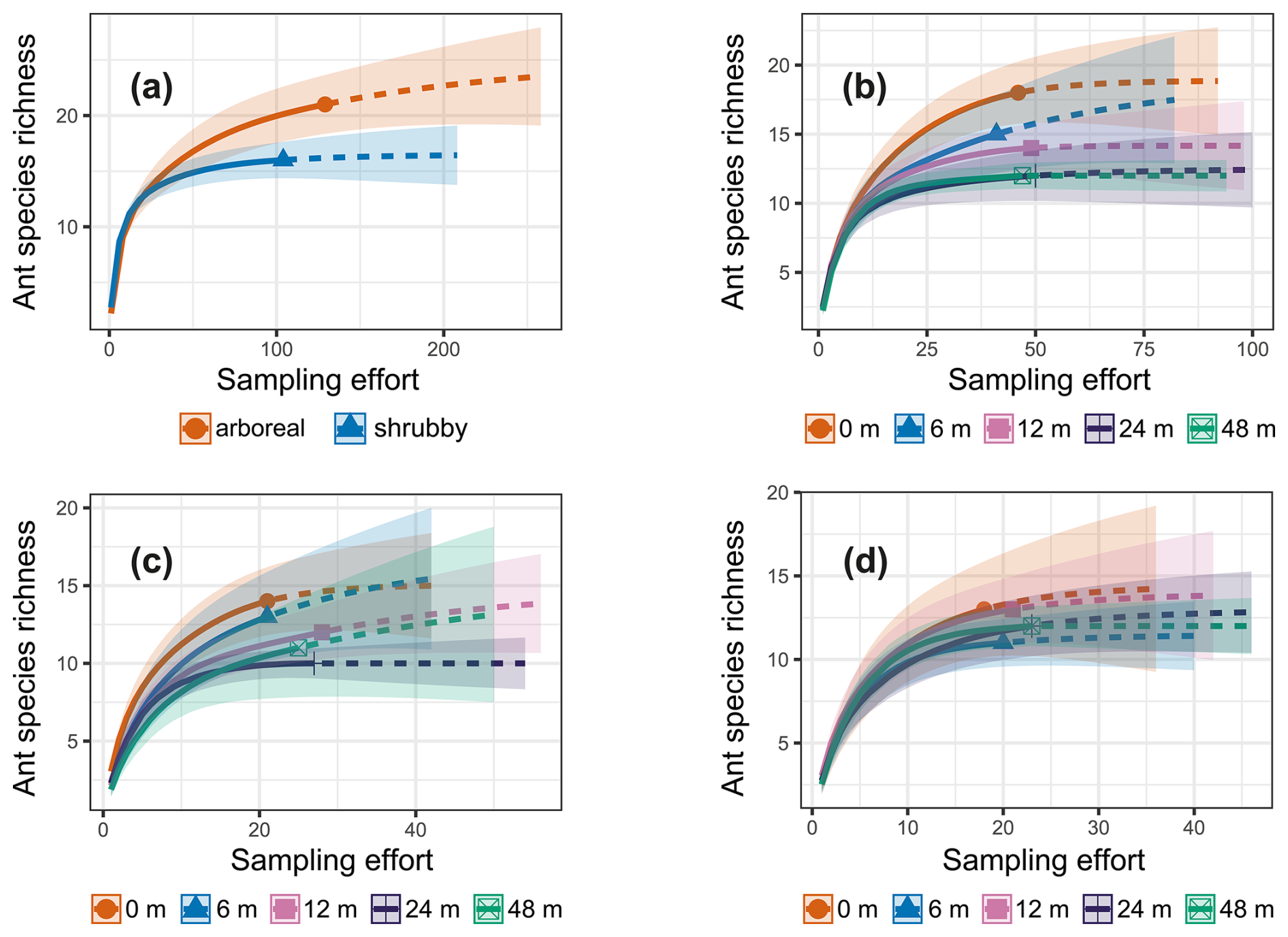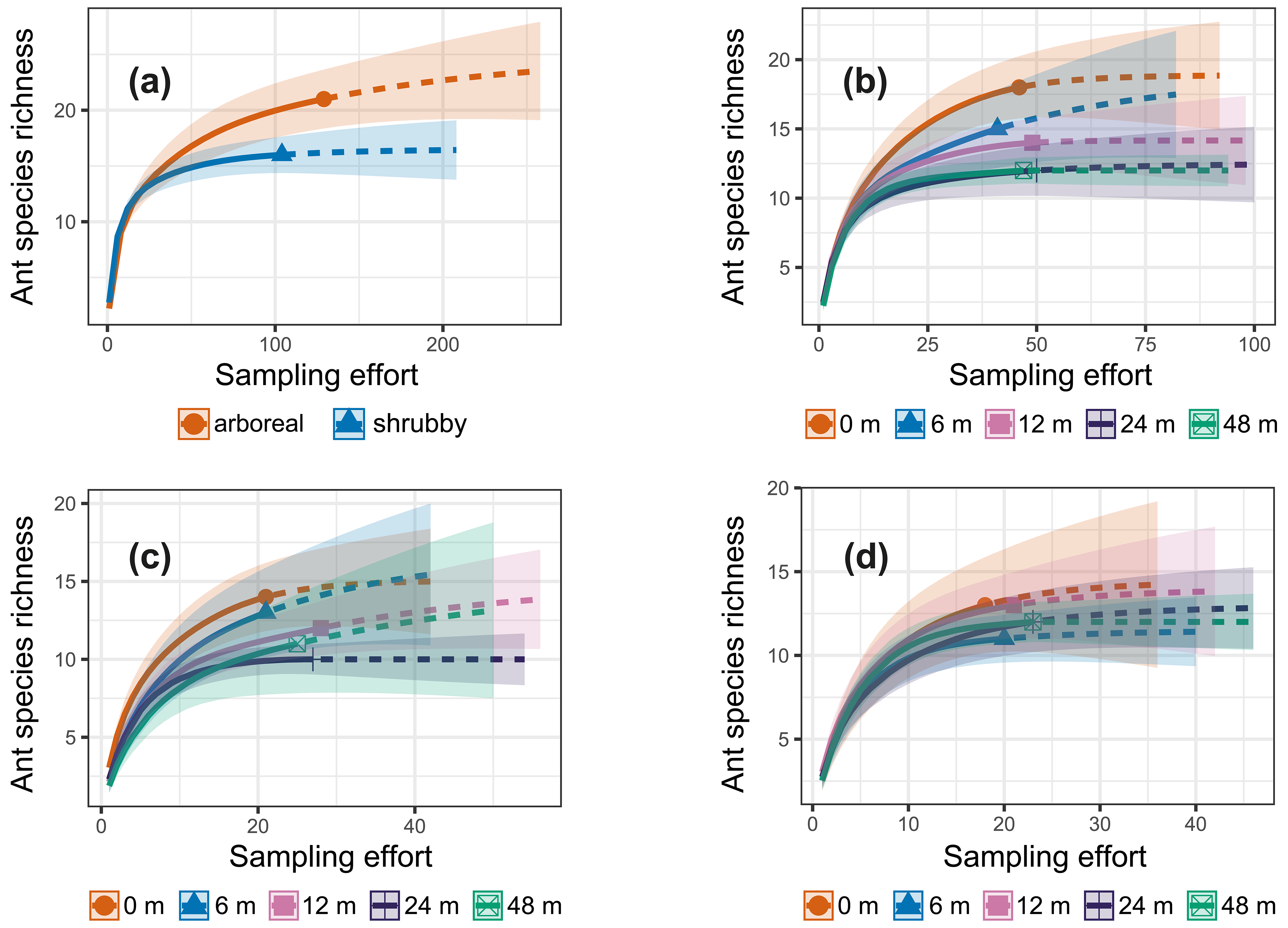 Figure 3iNext accumulation curves generated using sampling-unit-based (pitfall traps) incidence frequency data. The solid lines represent the observed species richness, while the dashed lines show the expected species richness if sampling efforts were doubled. The colored bands indicate standard errors. The data are presented as follows: (a) comparison between arboreal and shrubby hedgerows, (b) species richness across the five sampling distances, (c) for arboreal hedgerows the species richness at the five sampling distances and (d) for shrubby hedgerows the species richness at the five sampling distances.