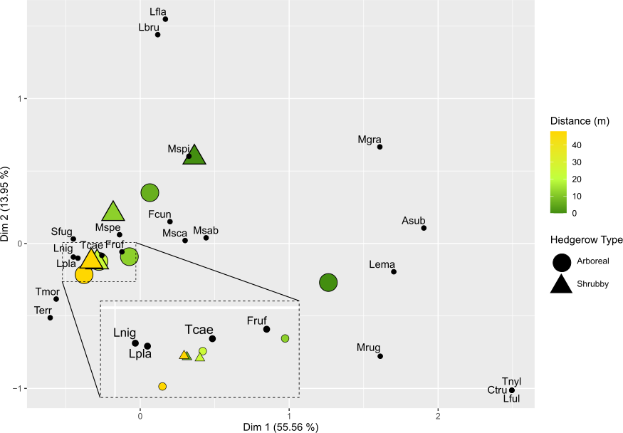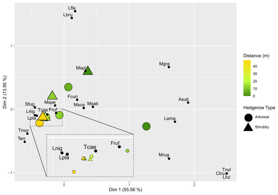 Figure 4Factorial correspondence analysis (FCA): multidimensional representation of ant community plots based on hedgerow distance and type. For visibility purposes, the FCA was computed for each distance grouping of hedgerows following their type. The first two dimensions are shown along with their associated percentage of explained variance. The distance from the hedgerow is represented by a color gradient (dark green and orange for short and long distances, respectively), while hedgerow type is indicated by shapes: round for arboreal hedgerows and triangular for shrubby ones. Species in these communities are represented and abbreviated using the first letter of the genus name, followed by the first three letters of the species name.
