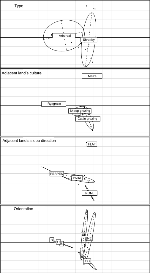 The impact of hedgerow geographical position (latitude and longitude), orientation, tree species richness, vegetation community, and the adjacent land culture and slope direction could not be further examined due to a lack of statistical power. However, preliminary multidimensional analyses (principal component analysis (PCA) and multiple correspondence analysis (MCA); FactoMineR (Kassambara and Mundt, 2020) and FactoExtra (Lê et al., 2008)) revealed no apparent correlation between these characteristics and hedgerow type (Fig. A1). Therefore, these variables are not a priori involved in our hedgerow types.