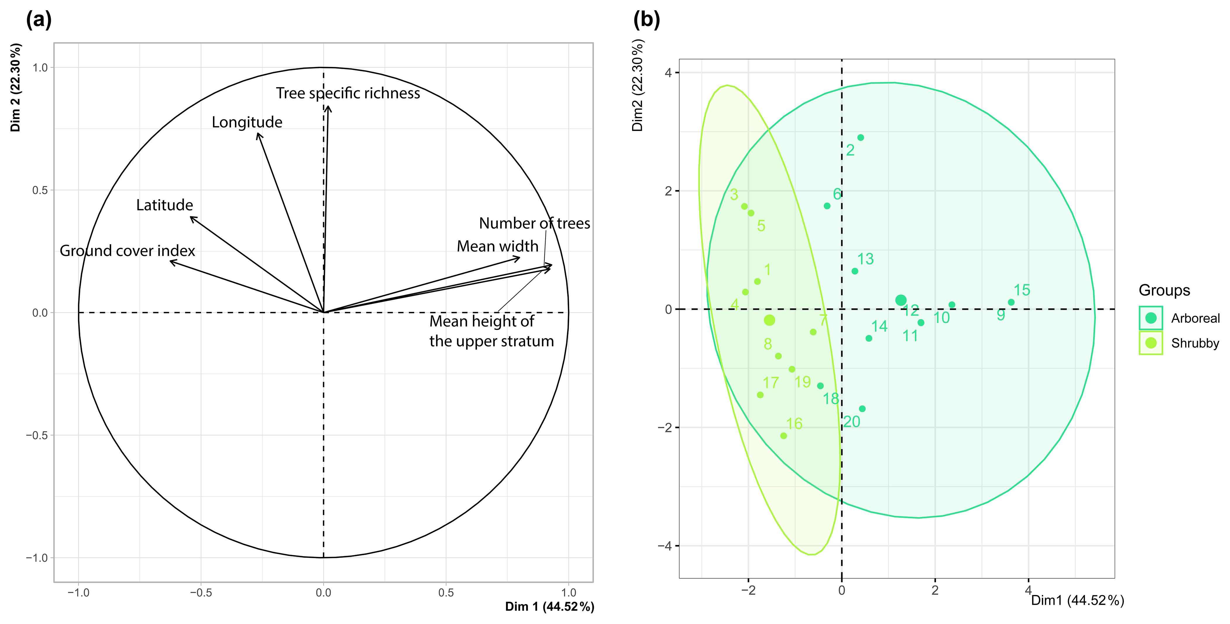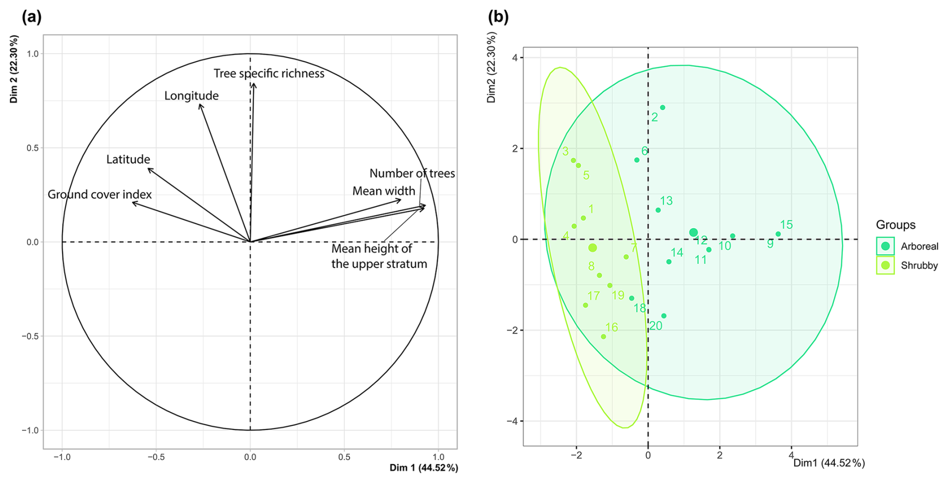 During fieldwork, two distinct types of hedgerows were observed: arboreal and shrubby, which were later differentiated based on vegetative structure. Specifically, arboreal hedgerows were defined as those exceeding 5 m in height along at least 75 % of their length (n= 11) and with at least five trees (i.e., base diameter  20 cm). The remaining hedges (n= 9) were categorized as shrubby. Hedgerow type allowed us to synthesize four hedgerow-related variables – height, width, ground cover and tree count – as confirmed by the PCA preliminary analysis (FactoMineR and FactoExtra; Fig. A2a, b). For the remainder of the study, we primarily used these two hedgerow types to assess the impact of hedgerow characteristics and management on agricultural ant communities.