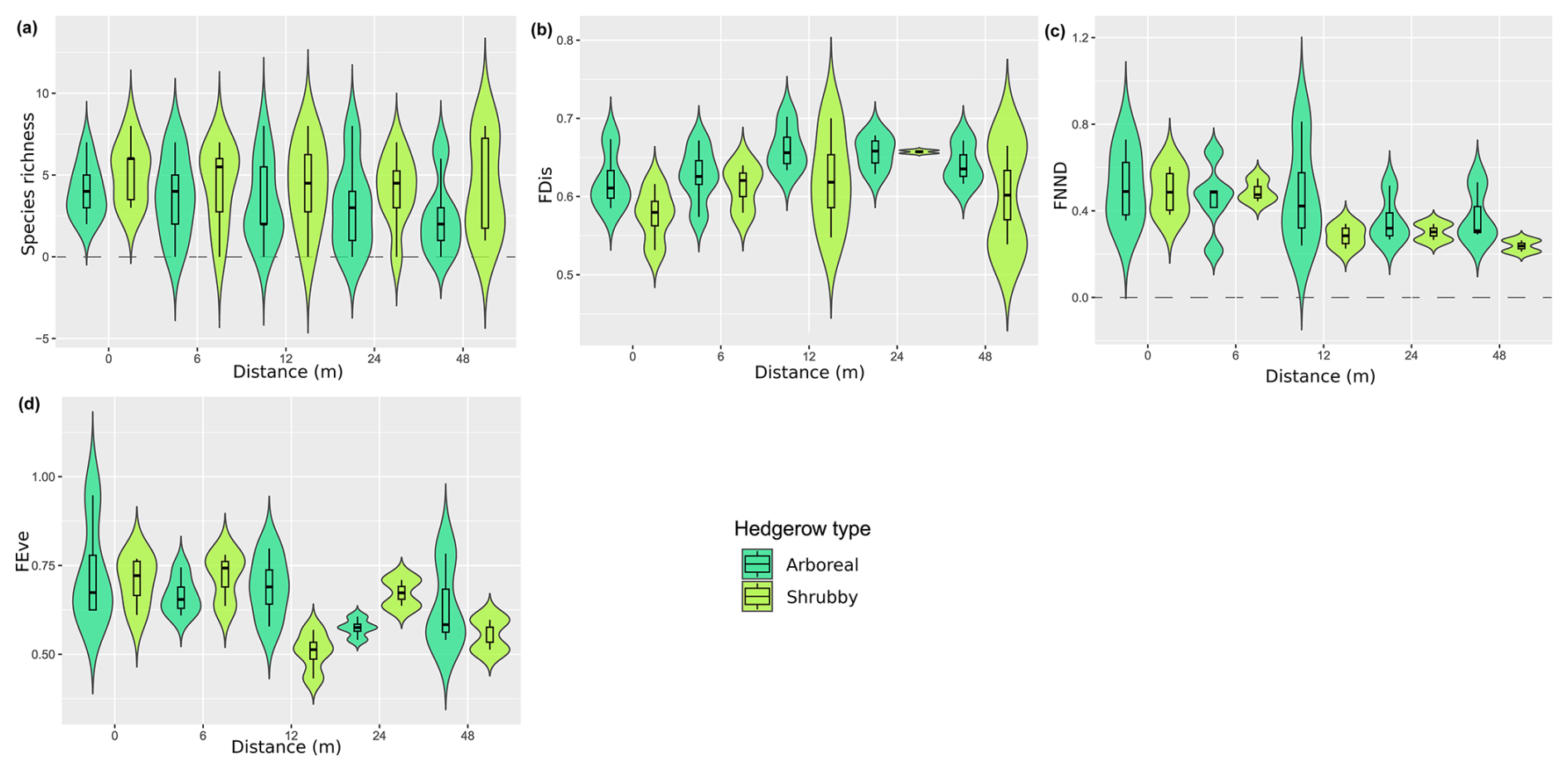 Functional evenness and functional mean nearest neighbor distance had higher values at short distances from hedgerows, with a step between 6 and 12 m, more pronounced for the latter index in arboreal hedgerows. This implies that there are greater minimal functional differences between species and that functions are more evenly distributed near hedgerows. Additionally, the low values observed for the FNND low values involved a higher functional redundancy at great distances from hedgerows. Moreover, functional diversity indices such as functional richness or functional diversity were not correlated with the distance gradient from hedgerows. This contrasts with our hypothesis that increasing distance to hedgerows would lead to a loss of functional performance, reflected in lower values of functional redundancy and diversity.