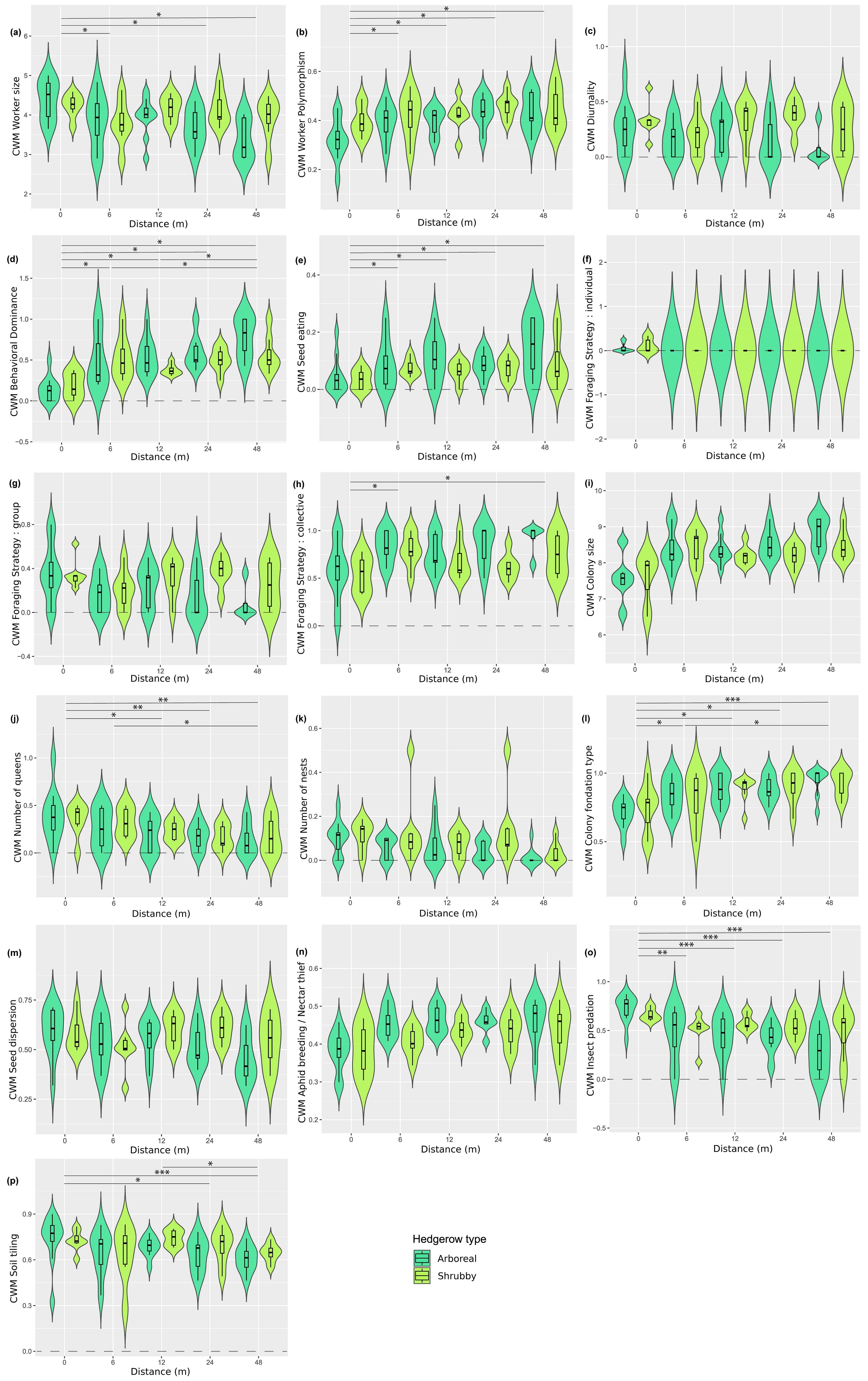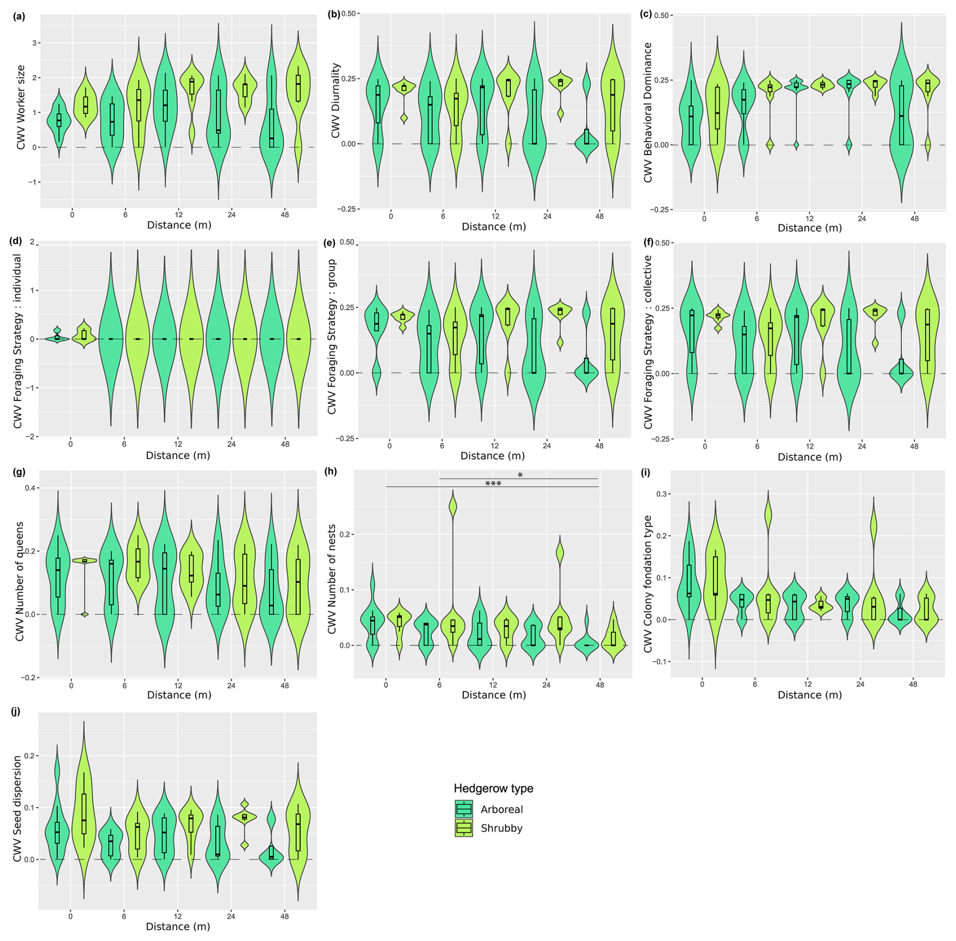 The community-weighted variance (CWV) of foraging strategies (individual, group and collective), number of nests and colony foundation type were significantly correlated with hedgerow distance, with greater variance observed at shorter distances from hedgerows (Table 2 and Fig. A6d, g–i, including Dunn tests).
