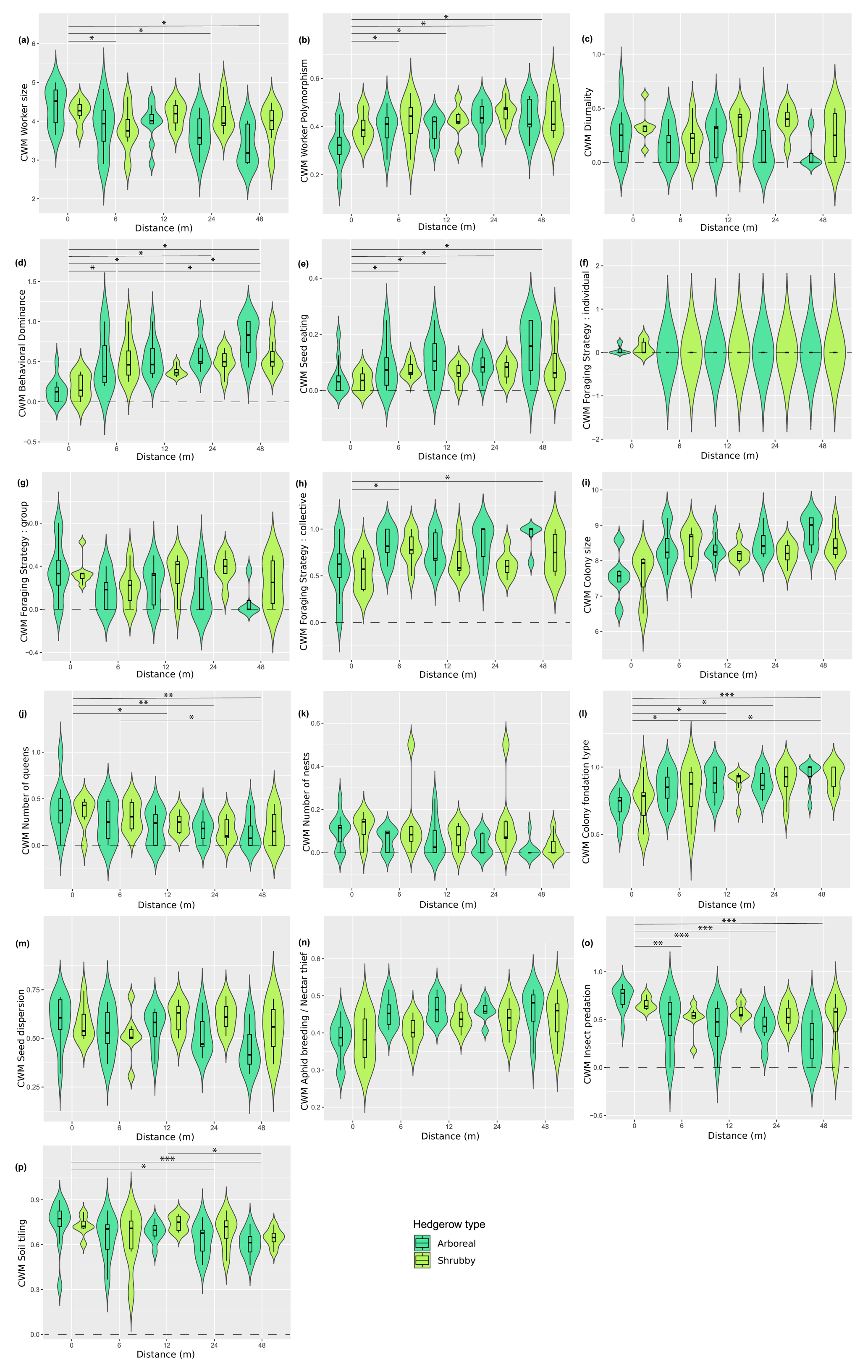 Additionally, five functional response traits were significantly correlated with hedgerow type (Table 2 Fig. A5b, c, g, h, k, including Dunn tests). Worker polymorphism, diurnality, number of nests and group foraging strategy had higher values in association with shrubby hedgerows, while collective foraging strategy showed higher values with arboreal ones. The CWV of worker size, diurnality, behavioral dominance, group foraging strategy, collective foraging strategy and number of nests were significantly correlated with hedgerow type; with shrubby ones showing higher variance than their arboreal counterparts (Table 2 and Fig. A6a–c, e, f, including Dunn tests).