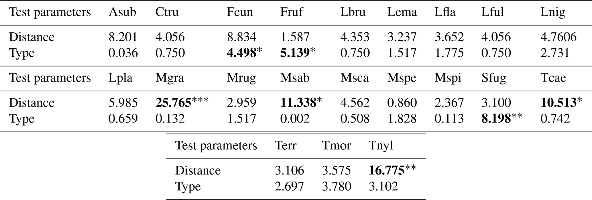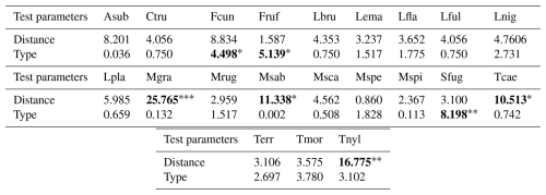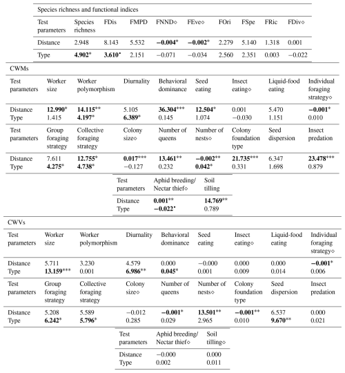Table 1Results of the general linear model (GLM) and Kruskal–Wallis analyses conducted for the species richness, functional indices, CWMs and CWVs of functional traits and presumed ecosystem (dis)services. GLM outputs are indicated with the symbol “” and all other outputs belong to Kruskal–Wallis analyses. We present the Kruskal–Wallis χ2 statistics and GLM coefficient estimates along with the significance levels of the pvalues, indicated as follows: < 0.06, < 0.05, < 0.01, < 0.001. Values are rounded to three decimal places (0.001) and set in bold when statistically significant. For “Type”, in the case of GLM, the intercept corresponds to the arboreal category.