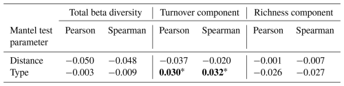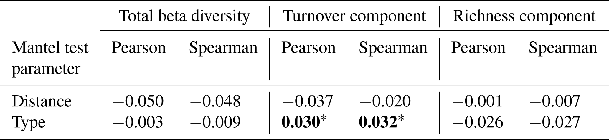 Table 2Results of Mantel matrix permutation tests with Pearson and Spearman correlations between the hedgerow distance and type matrix, and the Jaccard beta diversity matrix with two of its components (richness and turnover). The Mantel statistic is provided and the significance of the pvalue is indicated as follows: < 0.05, < 0.01, < 0.001. Values have been rounded to three decimal places (0.001) and set in bold when statistically significant.