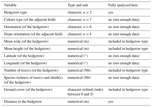Hedgerows and adjacent land characteristics can impact the biodiversity of macro-invertebrates within and around them (Barr et al., 2005). In this study, we defined two types of hedgerows: arboreal and shrubby. To achieve this categorization, we assessed for each hedgerow its height, width, geographic position and orientation, ground cover, tree species count and richness, vegetation community and adjacent agricultural use (including plant and cattle cultures) and slope direction from the hedgerow (see Table A1).