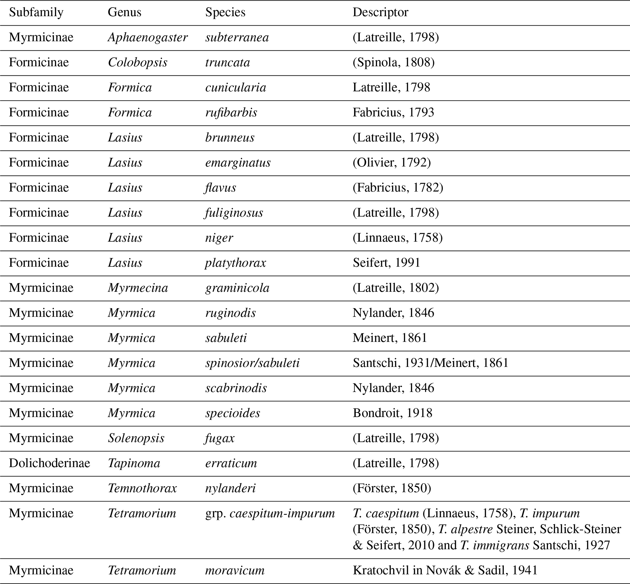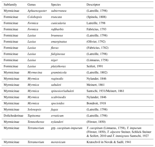 Ant identification was carried out at the species level, in 2021 and 2022, using recent taxonomic studies and keys specific to the Western Palearctic region (Lebas et al., 2016; Radchenko and Elmes, 2010; Rigato, 2011; Schlick-Steiner et al., 2006; Seifert, 1988, 1992, 2007, 2012; Seifert and Schultz, 2009; Steiner et al., 2010) and a Leica MZ4 stereomicroscope. Only worker ants were identified, as sexual individuals do not indicate the establishment of a species in a given area (Table S1 in the Supplement).