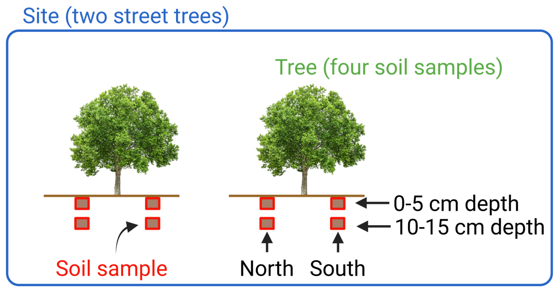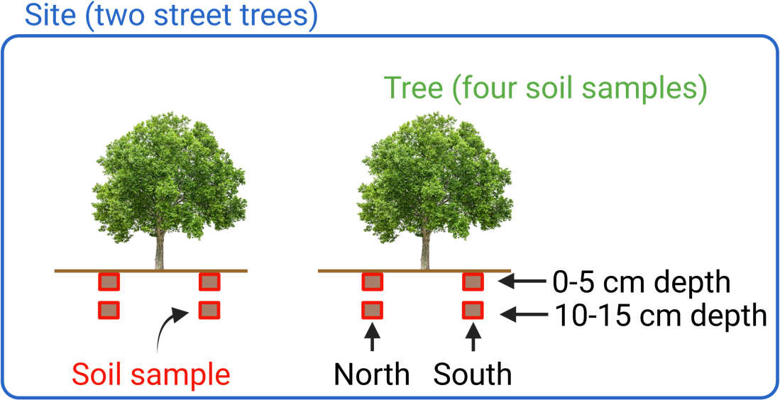 Throughout the city, we chose 20 sites where solitary London plane street trees (Platanus × acerifolia) were present in paved streets and where the soil in which the tree was rooted was unsealed and thus accessible for sampling. These sites represent the largest spatial distance level in this study and were between 100 m and 7 km apart. At each site, soil samples were collected under two different trees (Fig. 1). Trees of the same site were between 3 and 20 m apart, representing the second-largest spatial distance level in this study. At each tree, two orientations (north and south) were sampled, which were between 1 and 3 m apart, representing the smallest spatial distance level in this study. Since these samples were taken close to the same tree, we can assume that they have a similar history of soil manipulation. Finally, at each orientation under each tree at each site, the upper mineral soil was sampled at two soil depths: from 0 to 5 cm and from 10 to 15 cm. In total, 160 soils were sampled between 13 February and 31 March 2023.