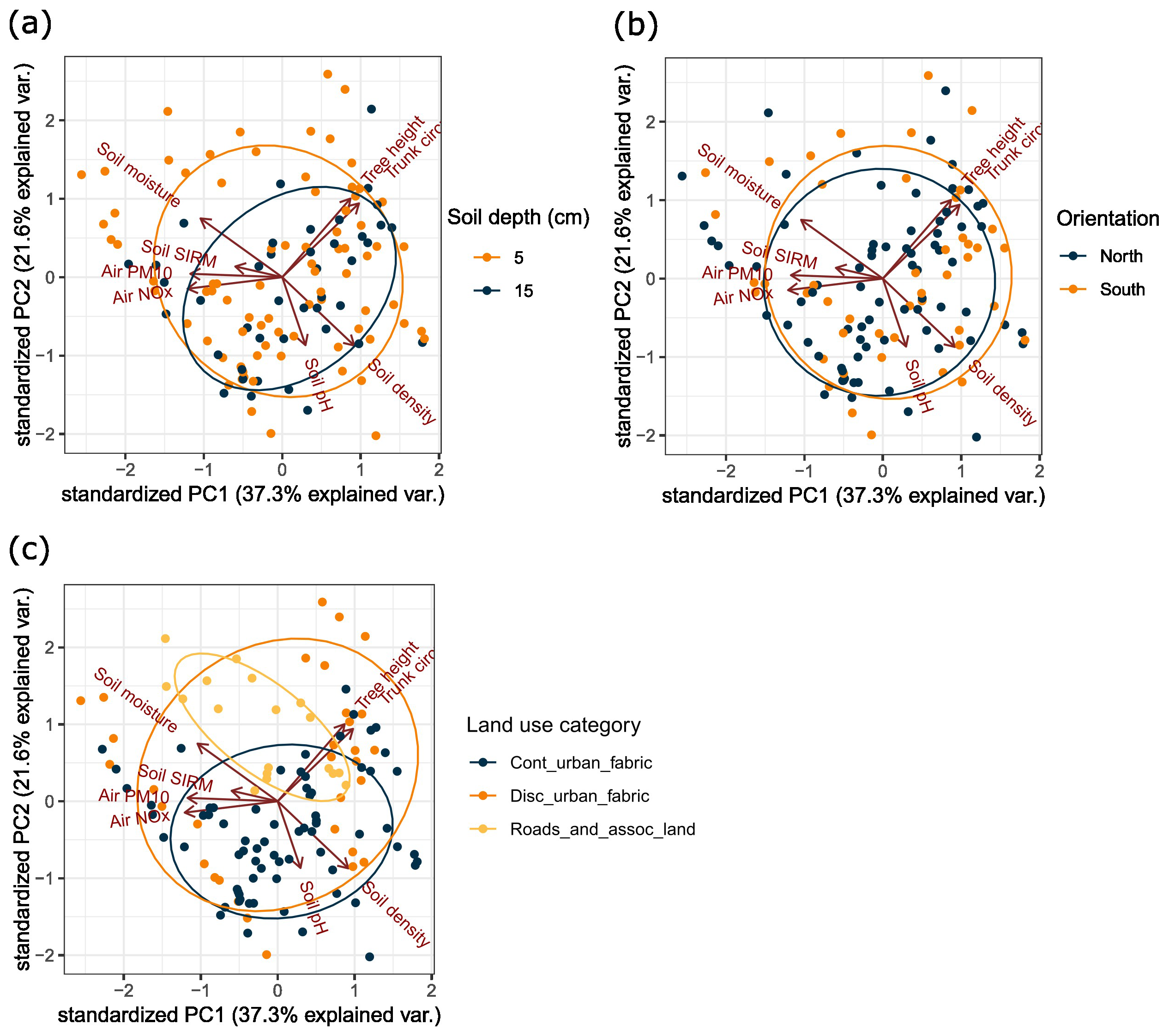 Figure 2PCA of the different soil and environmental properties per soil sample recorded in this study. The colour of the dots indicates (a) the soil depth of where the sample was taken, (b) the orientation of where the sample was taken compared to the focal tree, and (c) the major land use class of the site where the sample was taken.