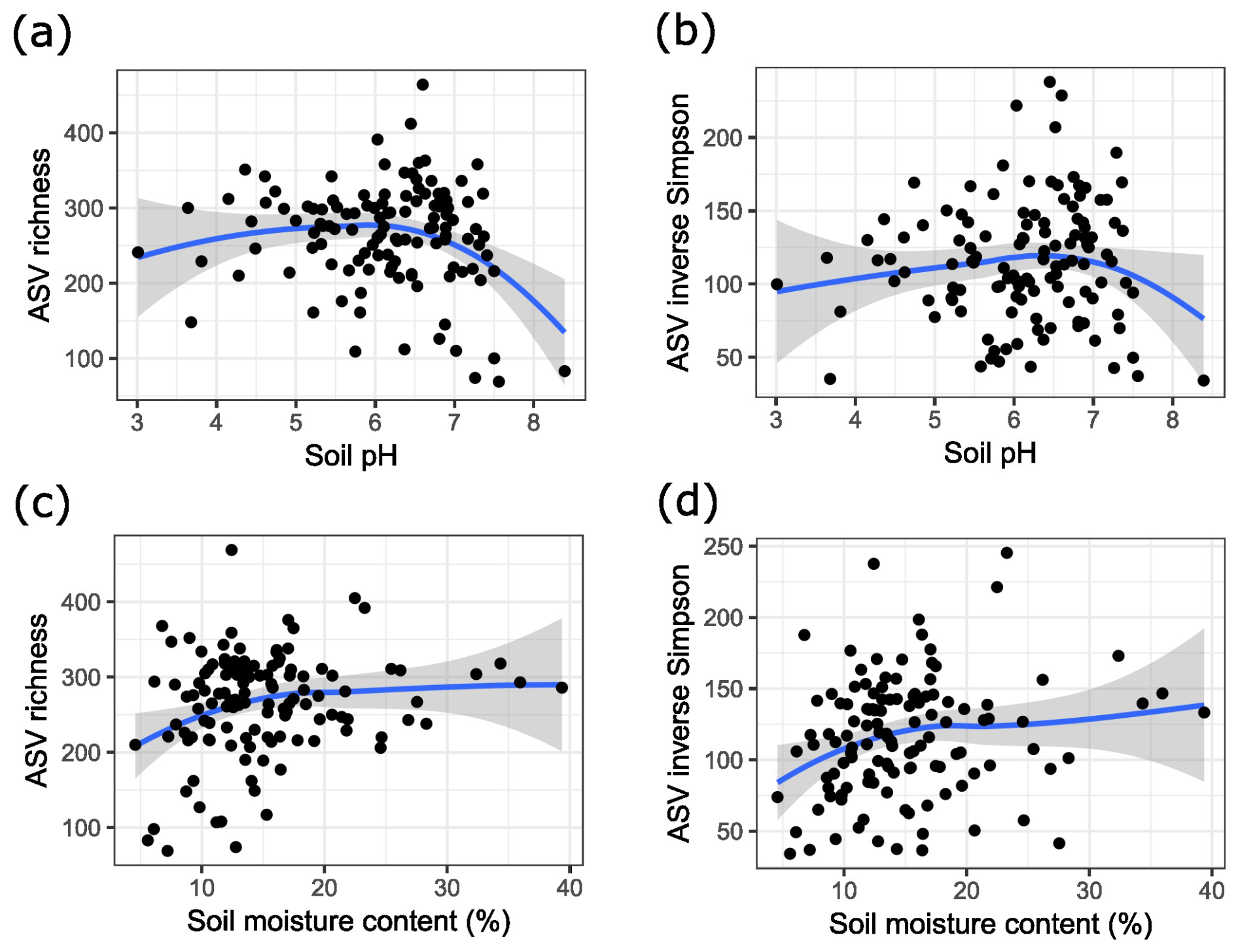 Figure 3(a) ASV richness of bacterial soil communities in relation to soil pH. (b) Diversity of bacterial soil communities expressed as the inverse Simpson index in relation to soil pH. (c) ASV richness of bacterial soil communities in relation to soil moisture content. (d) Diversity of bacterial soil communities expressed as the inverse Simpson index in relation to soil moisture content. The blue lines are the result of local polynomial regression fitting, and the grey area indicates the 95 % confidence interval.