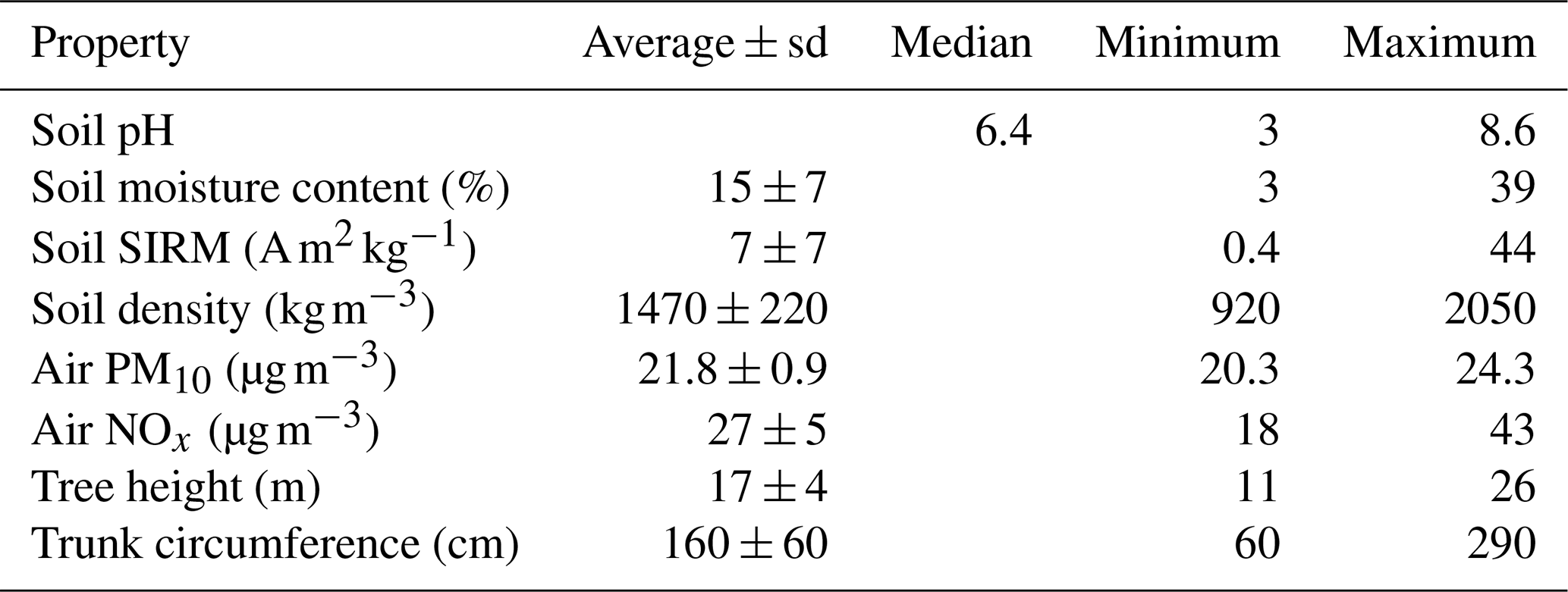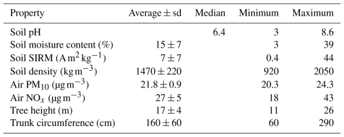 Several soil, air, and tree properties were recorded for each sample in this study and are summarized in Table 1. Correlation analyses (Table 2, Fig. 2) showed a negative correlation between soil moisture content and soil pH, while moisture content was positively correlated with soil ln(SIRM) value. In addition, there was a significant positive correlation between atmospheric PM10 concentrations and atmospheric NOx concentrations.