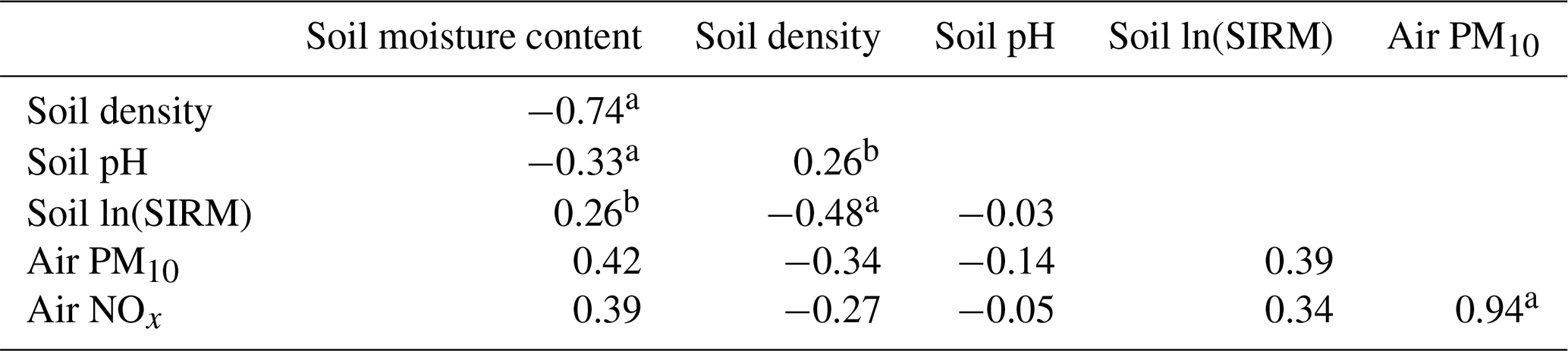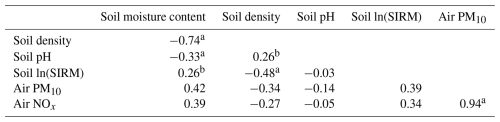 Table 2Correlations between environmental variables, including soil properties and air quality.