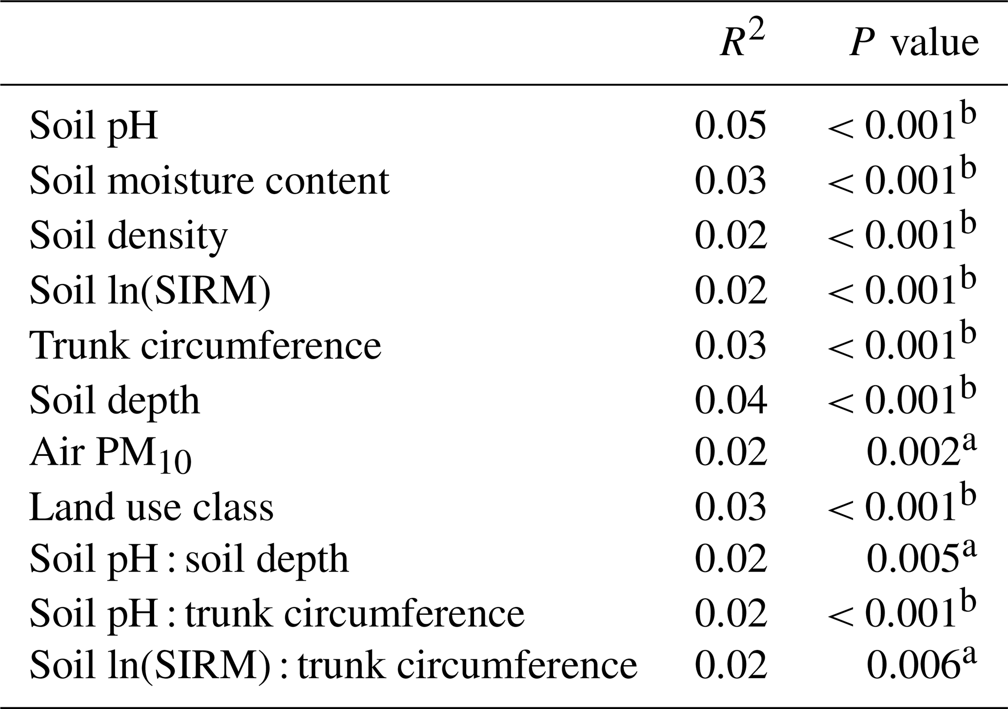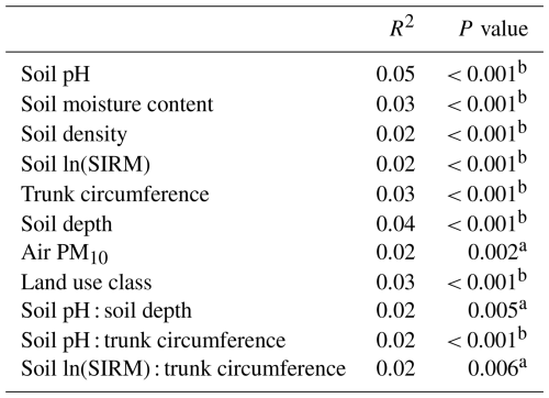 Table 3The explanatory power of different soil properties for the soil bacterial community variation according to a PERMANOVA (9999 permutations). SIRM served as a proxy for heavy metal pollution, trunk circumference served as a proxy for tree age, and air PM10 served as a proxy of traffic-related pollution.