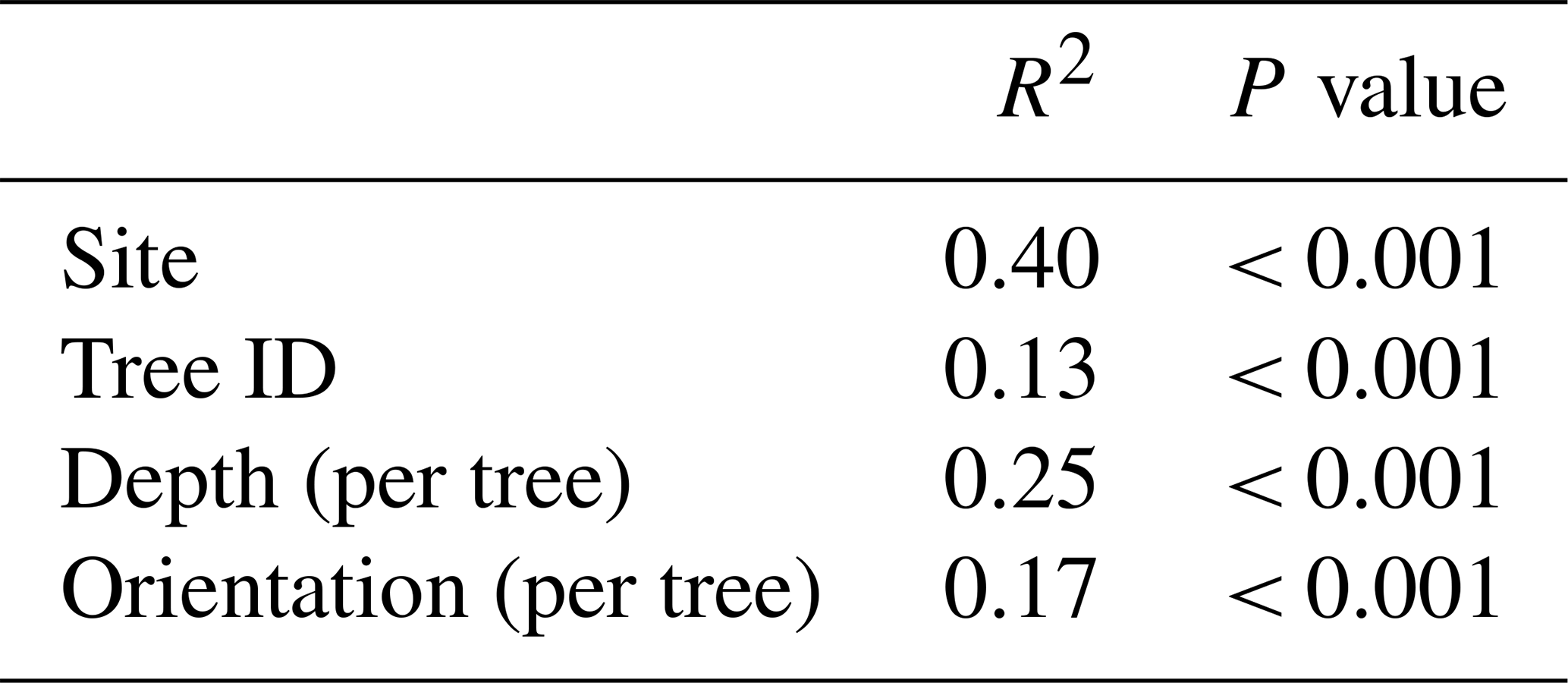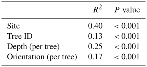 When adding the spatial distance level factors “site” and “tree ID” to the PERMANOVA of the soil characteristics (Table 3), we observed that some of the site variation is explained by soil characteristics (site goes from R2 = 0.40 to R2 = 0.30), but the effect of tree variation remains the same and is not further explained by soil characteristics.